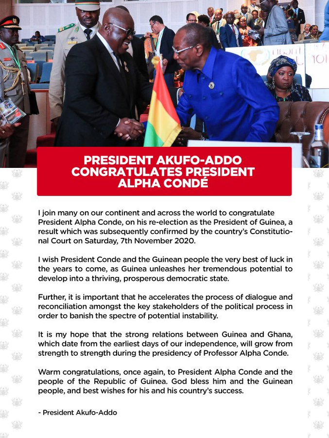 President Akufo-Addo has congratulated to Alpha Conde and Alassane Ouattara, Presidents-elect of the Republic of Guinea and the Ivory Coast respectively.